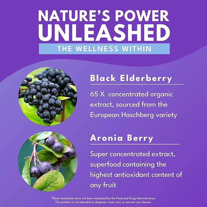 - Antioxidant Action & Immune Support: Our formula includes Acerola and Aronia Berry and packs an antioxidant punch delivering the equivalent of 12,670 mg of fresh elderberries and 19 mg of beneficial polyphenols in just one capsule.