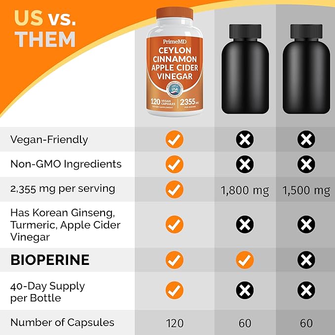 5-in-1 Ceylon Cinnamon Capsules 2355mg - Ceylon Cinnamon and Apple Cider Vinegar with Turmeric, Panax Ginseng, Cinnamon, and Bioperine, 120 ct