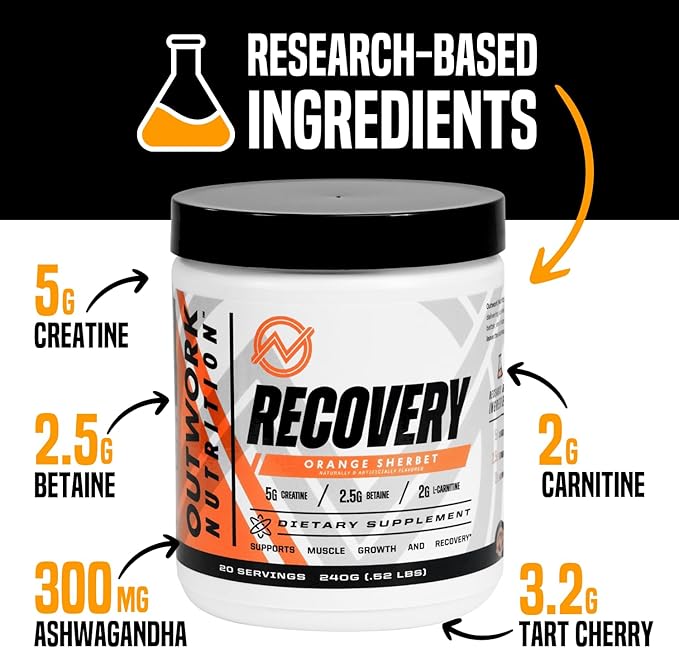 Outwork Nutrition Post Workout Recovery Powder - Creatine Monohydrate, KSM-66 Ashwagandha & Tart Cherry - Speeds Recovery, Eases Soreness - Creatine Powder for Men & Women, Orange Sherbet, 230 Gr
