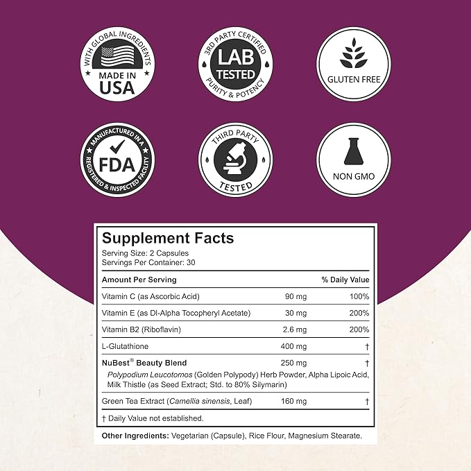 - Skin Beauty Formula: NuBest White contains Glutathione 400mg, Green Tea Extract, and a proprietary blend consisting of Polypodium Leucotomos, Alpha Lipoic Acid, and Milk Thistle extract which help to beautify skin naturally. This combination of ingredients is an antioxidant formula designed to protect and support cellular function.