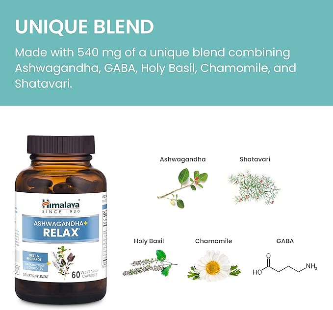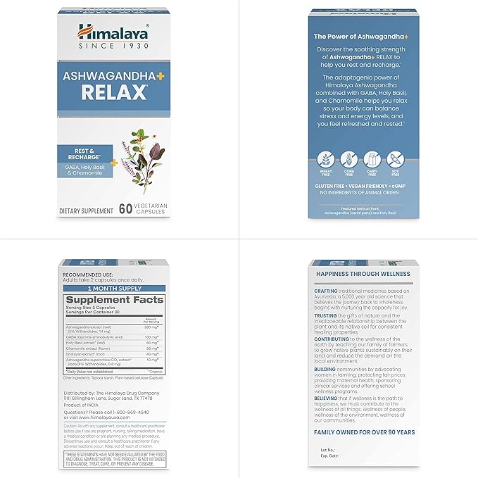 - Relieves Stress and Supports Relaxation: Himalaya Ashwagandha+ Relax herbal supplement helps your body adapt to stress and promotes deeper levels of relaxation.* GABA supports calm and a collected outlook and mindset.*