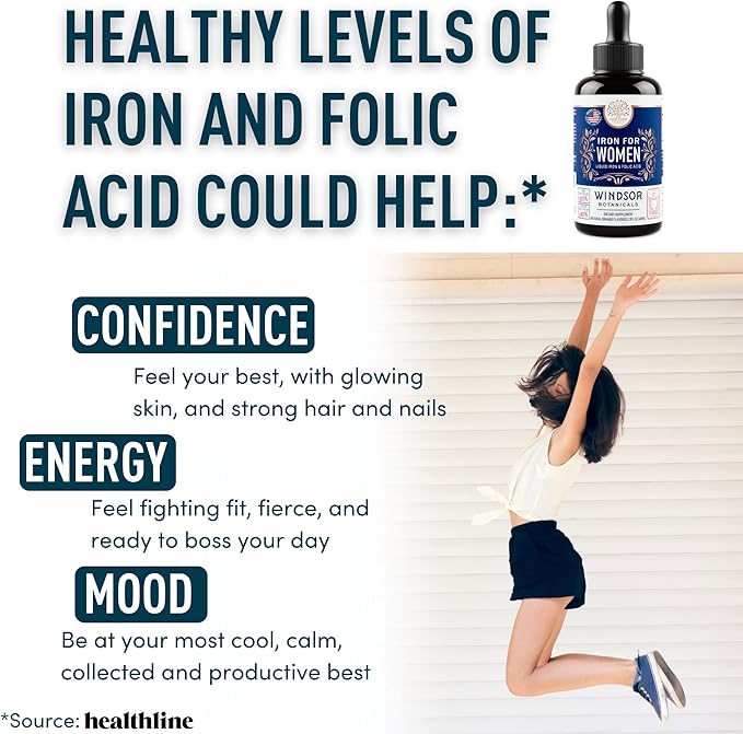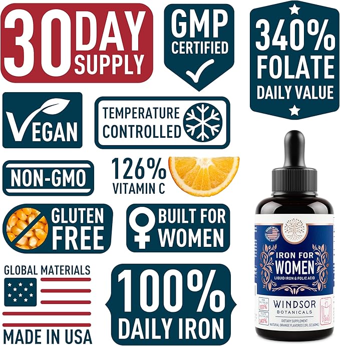 WINDSOR BOTANICALS Liquid Iron Supplements for Anemia - Folic Acid, Vitamin C, Vegan Blood Builder and Anemia Supplement - 2 oz Orange Flavor Gentle Iron Drops for Women