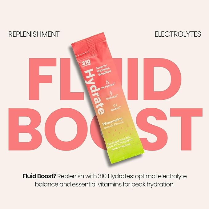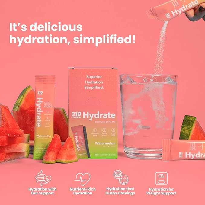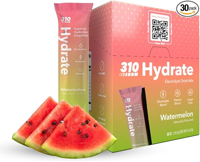 310 Hydrate Watermelon Electrolytes Powder Packets - No Sugar Hydration Packets with Key Vitamins & Minerals - Keto Friendly - Tasty Sugar Free Electrolyte Drink - 30 Single Servings