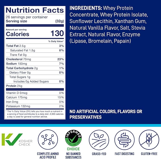 - 100% WHEY VANILLA PROTEIN POWDER: Each serving contains 24g protein, 2g carbs, 1.0 calories, and only 1g sugar.