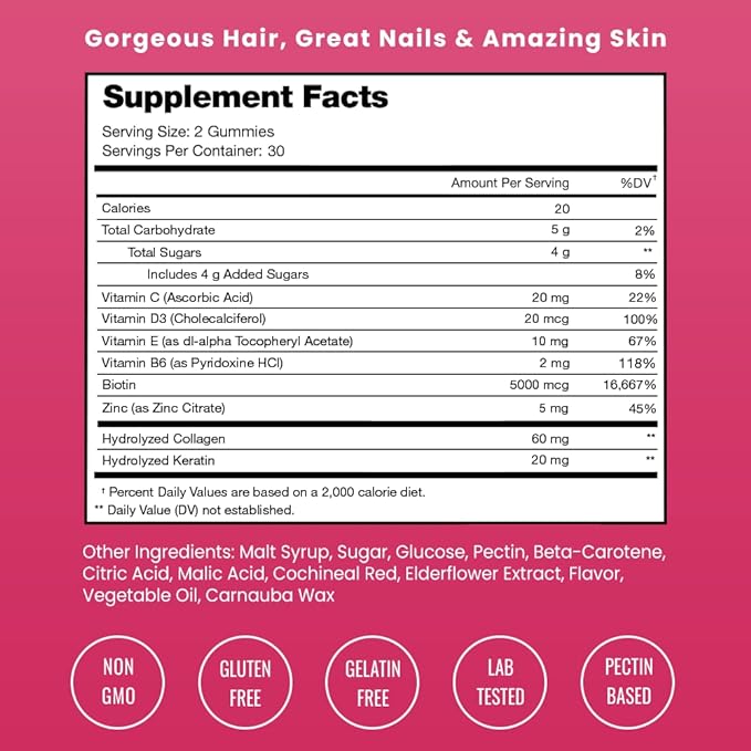 - Complete Beauty Complex - Packed with 5000mcg Biotin, 60mg Collagen, and 20mg Keratin and more, our Biotin+ gummies offer the ultimate beauty complex formula to support radiant skin, strong nails, and healthy hair.