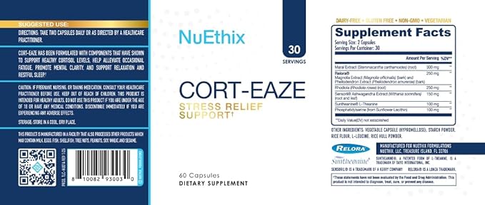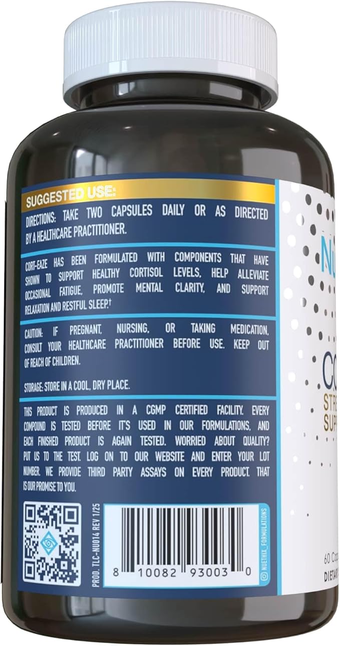 NuEthix Formulations Cort-Eaze - Cortisol Supplement - Health Support Supplement with Ashwagandha, L-Theanine & Rhodiola Rosea - Relaxation and Deep Sleep, 60 Capsules, 30 Servings