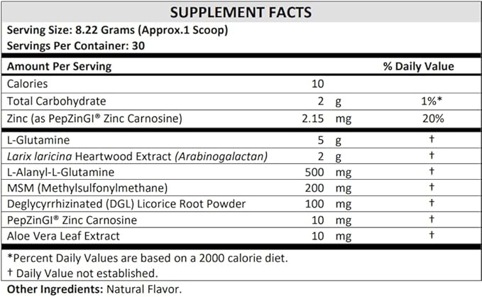 - LEAKY GUT: Featuring PepZinGI (Zinc Carnosine) works to fortify the intestinal lining and support the gut’s mucosal structure. Larix laricina prebiotic is a natural plant base fiber source for gut health