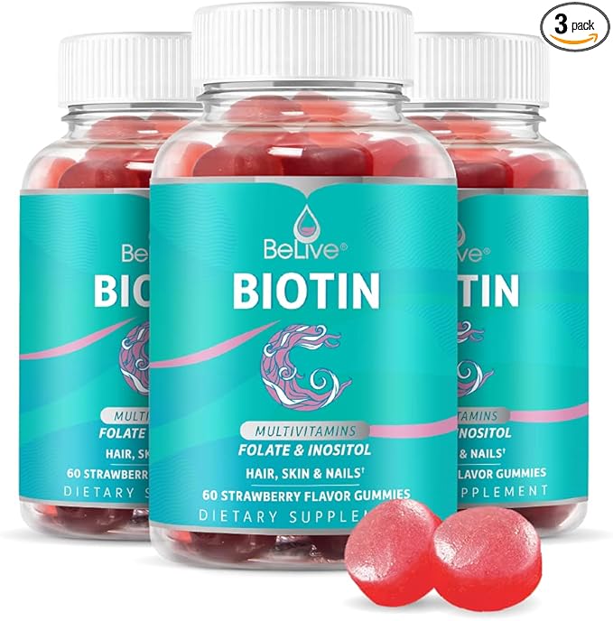 BeLive Biotin Gummies - Skin, Nails & Hair Vitamins with A, C, D, E, B12, Zinc, Folate & Inositol, Biotin Supplement for Anti-Aging, Energy & Collagen Boost, Multivitamin Gummies - Strawberry | 3-Pack