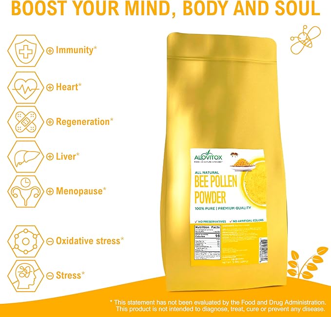 - 【 BEE POLLEN BENEFITS 】: Our Immune Support has one of the highest concentrations of absorbable antioxidants in any food. Our Bee Pollen Powder works to Supports your immune system by reducing oxidative stress & protecting your cells from damage caused by free radicals. Our Bee Pollen Extract has immune-boosting properties such as flavonoids, leukotrienes, catechins & phenolic acids (kaempferol, quercetin, and isorhamnetin)
