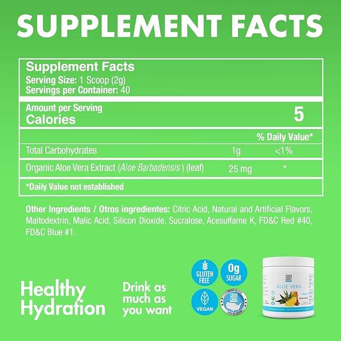 - PROMOTES PROPER HYDRATION: Yes You Can! Aloe Vera Drink Mix is an ideal organic drink mix for dehydration. Stay hydrated in a delicious and healthy way with a water-dense plant like aloe vera. At Yes You Can, we pride ourselves on using all natural ingredients in our supplements.