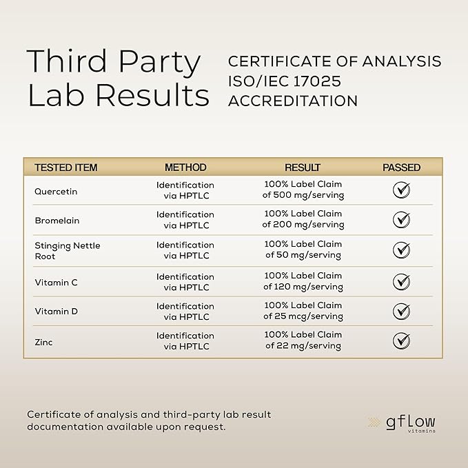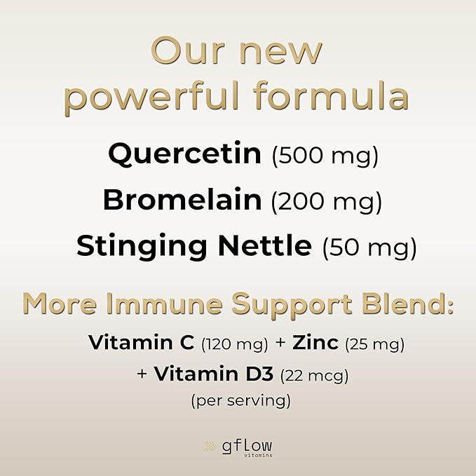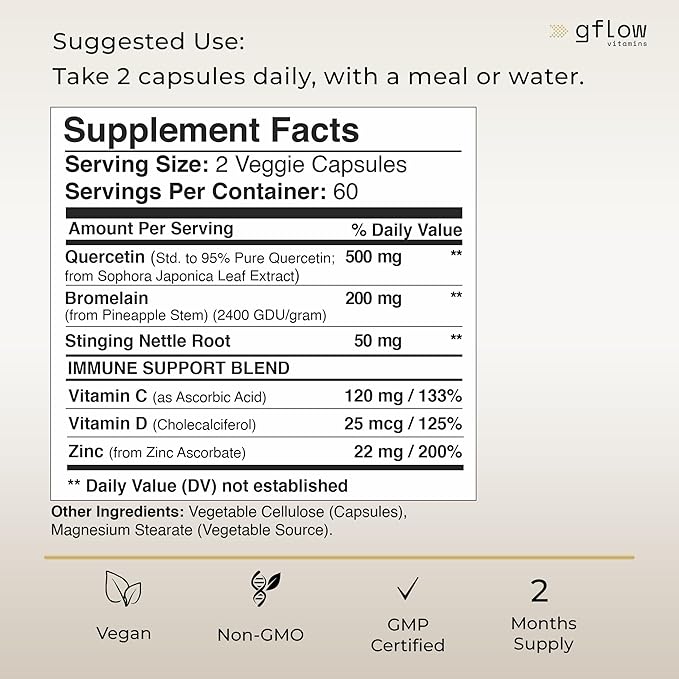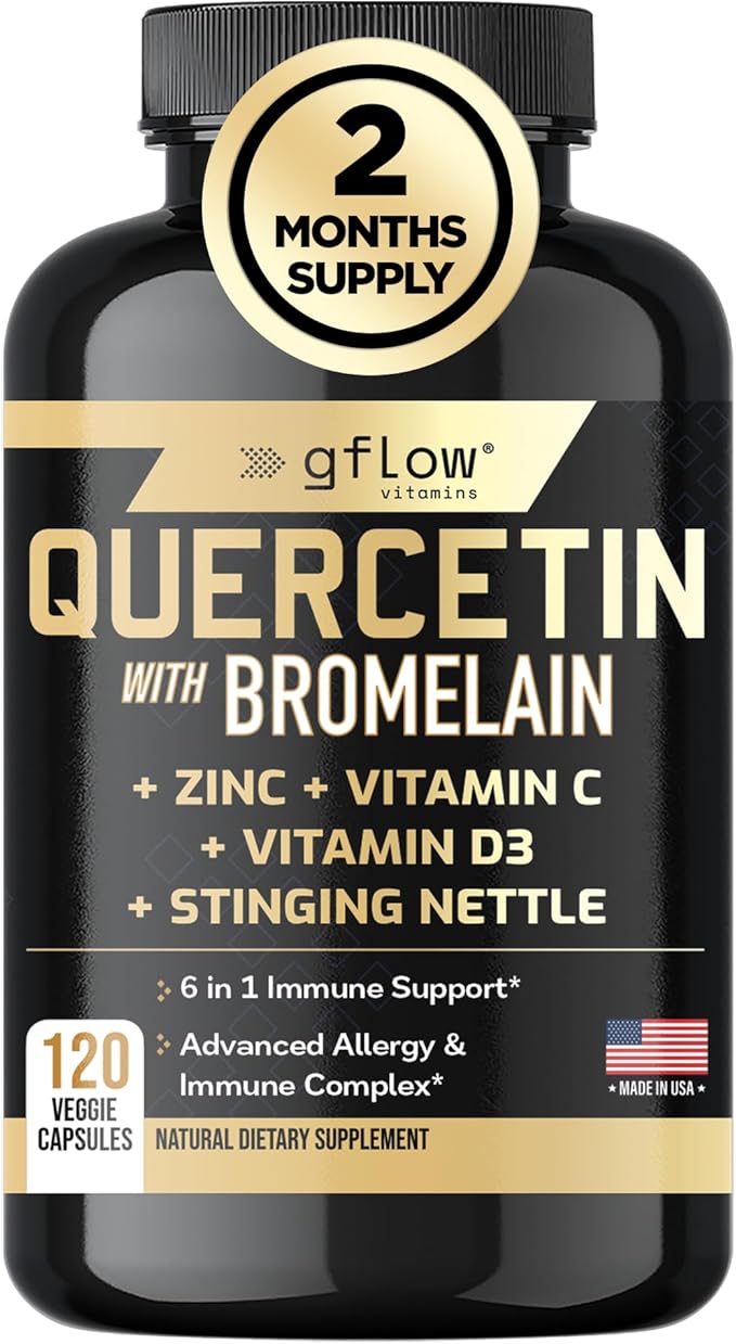 - A POWERFUL COMBINATION TO BOOST THE IMMUNE SYSTEM: Quercetin is a plant pigment naturally found in fruits and vegetables. Gflow Quercetin with Bromelain has also vitamin C, Zinc, and Vitamin D3, as well as stinging nettle root. Stinging nettle capsules work together with the other ingredients to help the body absorb the quercetin more effectively. It's a great substitute for quercetin powder, bromelain powder, and zinc supplements