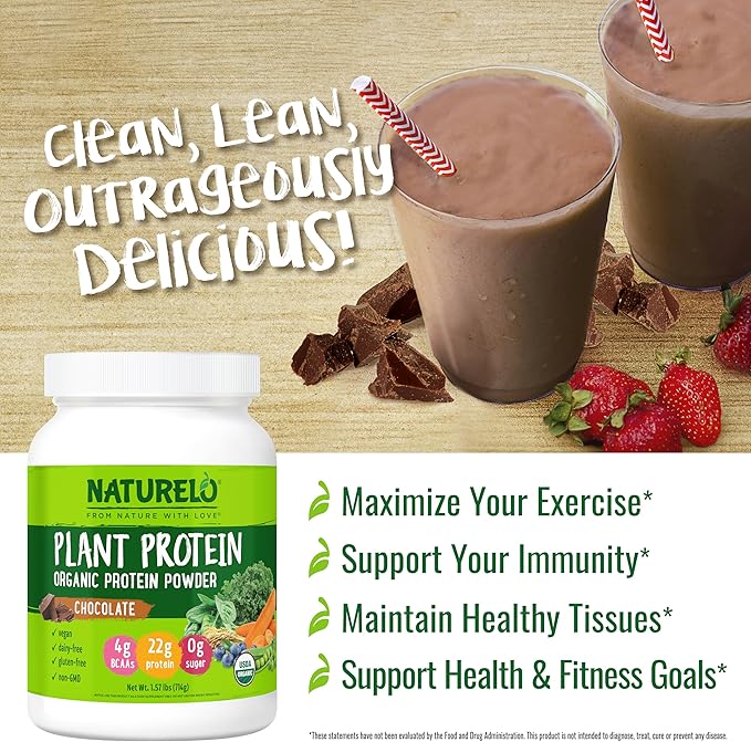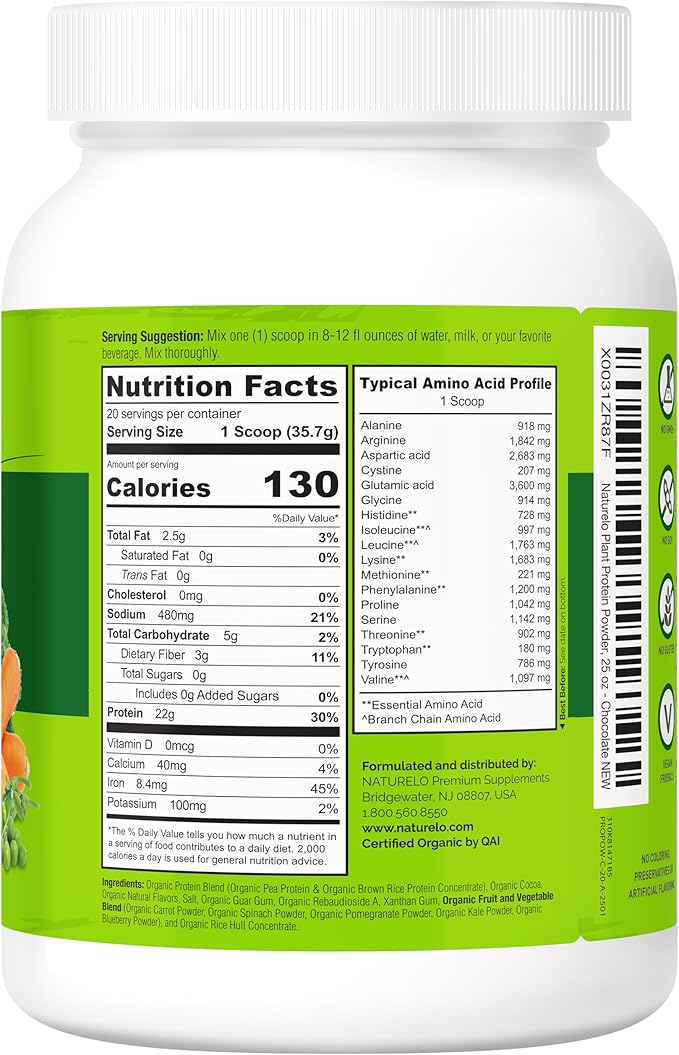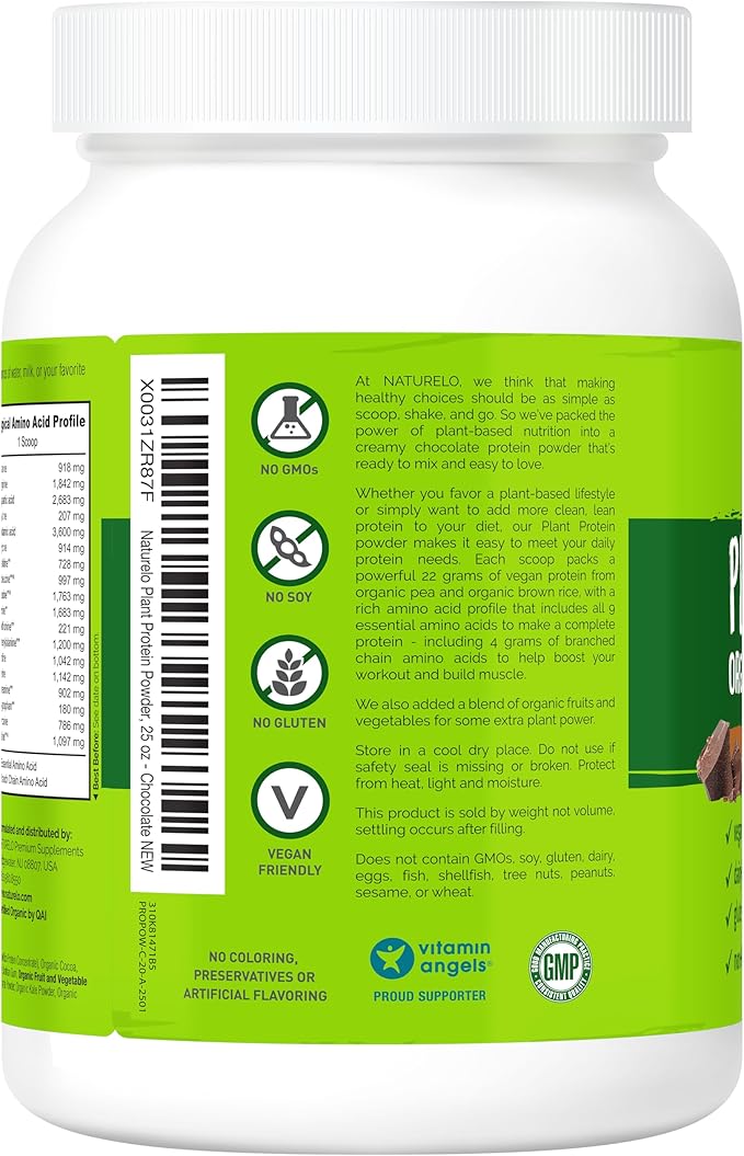 NATURELO Plant Protein Powder, Chocolate, 22g Protein - Non-GMO, Vegan, No Gluten, Dairy, or Soy - No Artificial Flavors, Synthetic Coloring, Preservatives, or Additives - 20 Servings