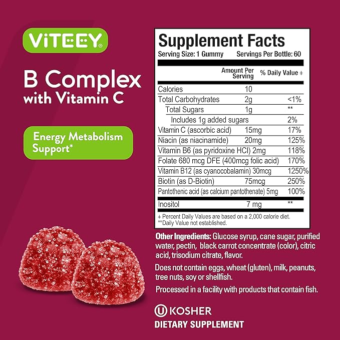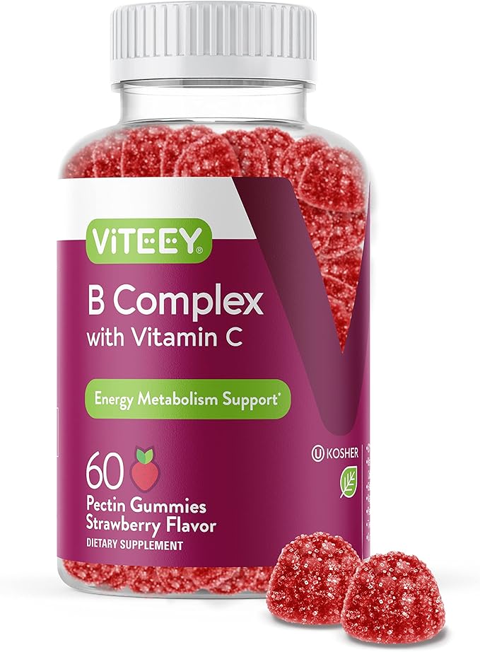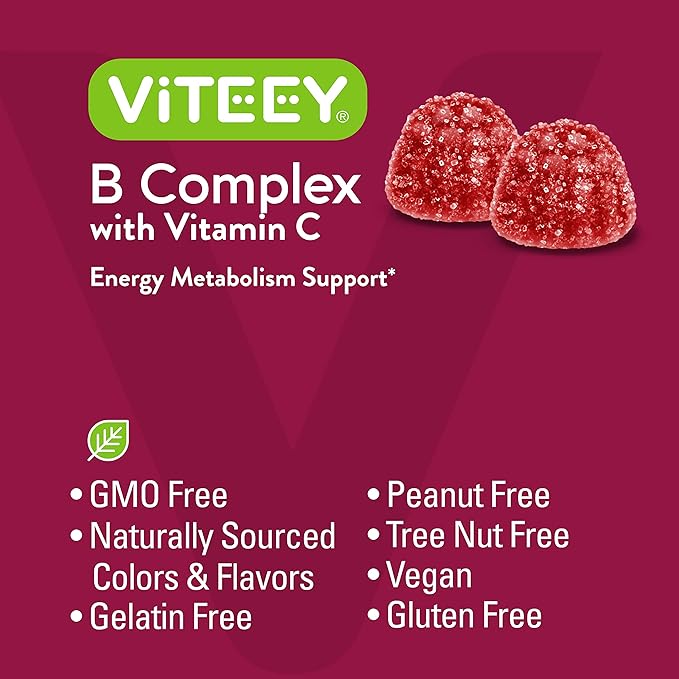 Viteey Vitamin B Complex Gummies with Vitamin C - Energy, Metabolism & Immune Support - B6, B12, Niacin, Folic Acid, Biotin, Calcium - Vegan, Gluten-Free - 60 Count