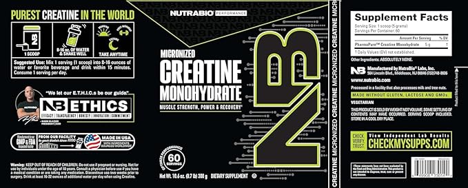 - Pure Monohydrate Creatine: Enhance energy production, promote muscle growth, and improve your physical performance with NutraBio’s Creatine Monohydrate. Every batch is tested by a third-party lab and verified to be 99.9% pure creatine monohydrate.