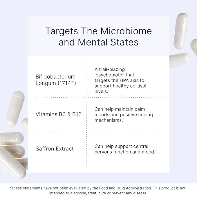- 1714: A Trail-blazing Psychobiotic - In a 4-week human trial, Bifidobacterium longum 1714 probiotic reduced perceived stress, improved memory performance, reduced mental fatigue, positively supported brainwave activity, and improved ability to handle occasional stress. This bifidobacterium probiotic exerts its effect by targeting the HPA axis to support healthy cortisol levels.*