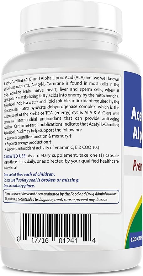 - 750 mg of Acetyl L-Carnitine Alpha Lipoic Acid per Capsule - 120 Capsules per Bottle.