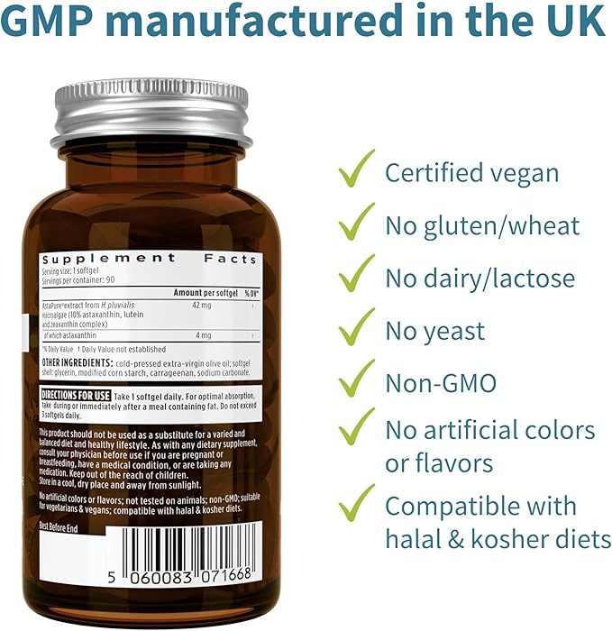 - VEGAN, SUSTAINABLE & GREEN: a sustainable source of astaxanthin, manufactured using green technology, and does not negatively affect ecosystems or contain contaminants from the sea; supplied in vegan seaweed capsules