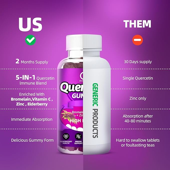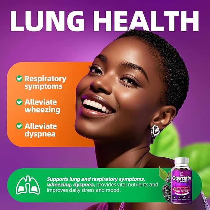 - 5 IN 1 IMMUNE SUPPORT - An immunity vitamin supplement like none other. Quercetin, Bromelain, Zinc, Vitamin C, and Elderberry for Adults and Kids all in one mouth watering gummy. Our Quercitine is packed with over 60 gummies per bottle, for lung and respiratory support. Zinc, for an extra immune and antioxidant support.