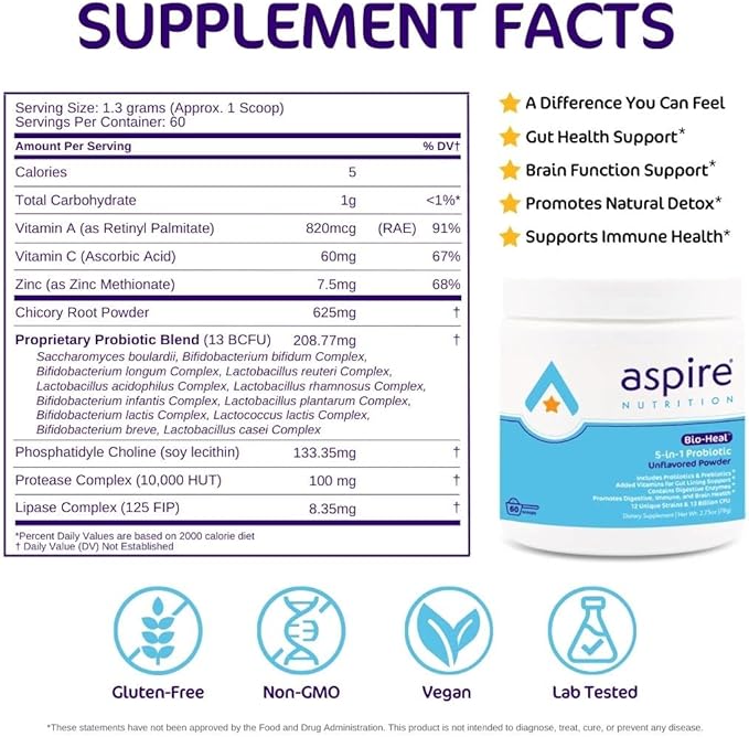 - 70% of your immune system is in your gut. Aspire Nutrition's Bio-Heal helps replenish beneficial bacteria to support immune health, digestive and intestinal health, gut health, and constipation.
