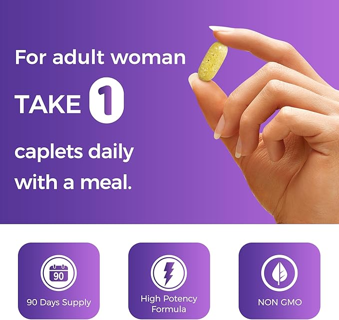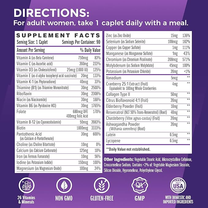 - HIGH POTENCY ONE DAILY MULTIVITAMIN: Featured with 25 key vitamins and minerals plus herbs including Vitamin A, C, D, E, B-complex, Biotin, Calcium and Iron for women's wellness support;* Adult women should take one caplet daily with a meal