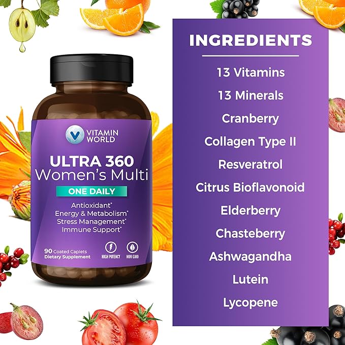Vitamin World Ultra 360 Multivitamin for Women One Daily, Women's Multivitamin with Collagen, Ashwagandha & Antioxidants, Supplement with Vitamin A, B, C & D for Energy & Immune Support, 90 Caplets