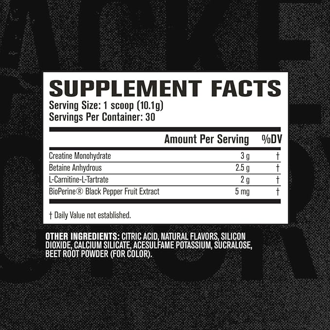 - Special Ingredients : Betaine Anhydrous, Black Pepper Fruit Extract, Creatine Monohydrate, L-Carnitine, L-Tartrate