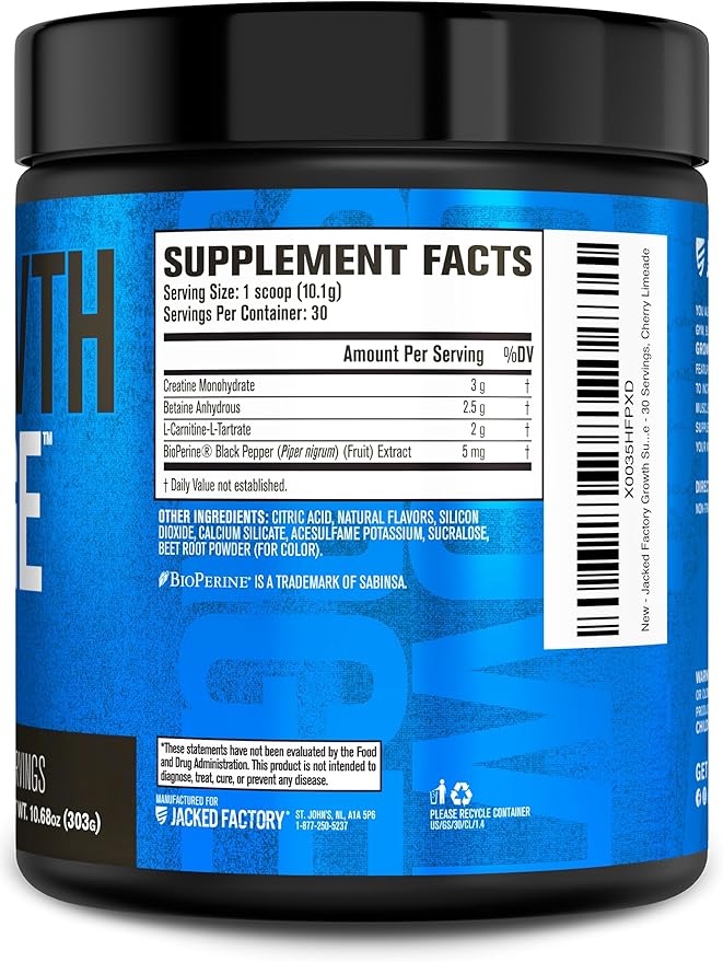 Jacked Factory Growth Surge Creatine Post Workout w/L-Carnitine - Daily Muscle Builder & Recovery Supplement with Creatine Monohydrate, Betaine, L-Carnitine L-Tartrate - 30 Servings, Cherry Limeade