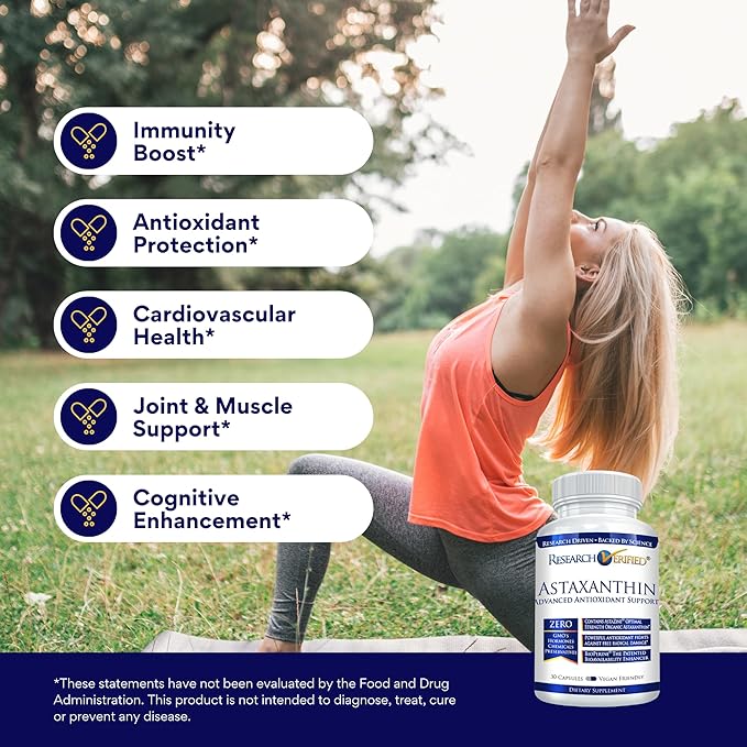 Research Verified Astaxanthin - Powerful Antioxidant, Fights Free Radicals, Supports Skin, Brain, Eyes, and Heart - Zinc RDA, Vitamin E, BioPerine - 30 Capsules - Non-GMO, Made in The USA