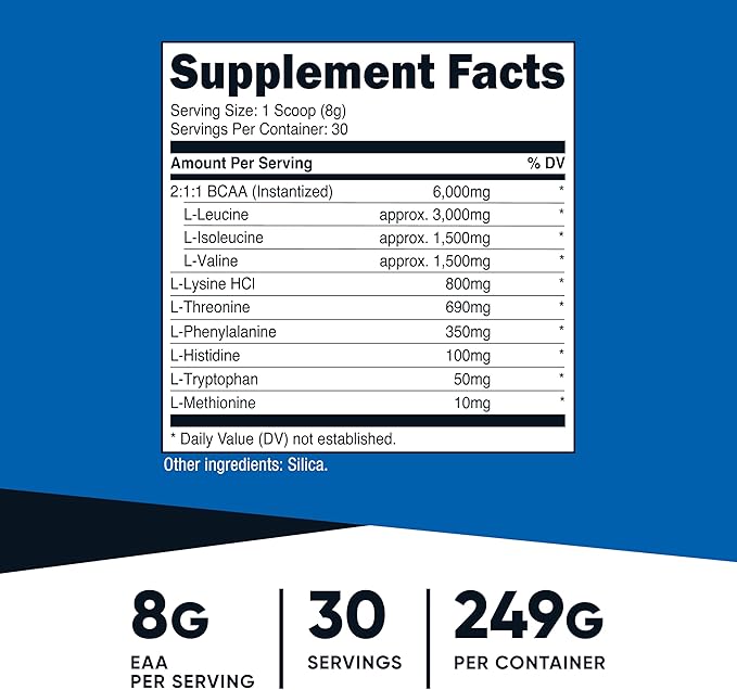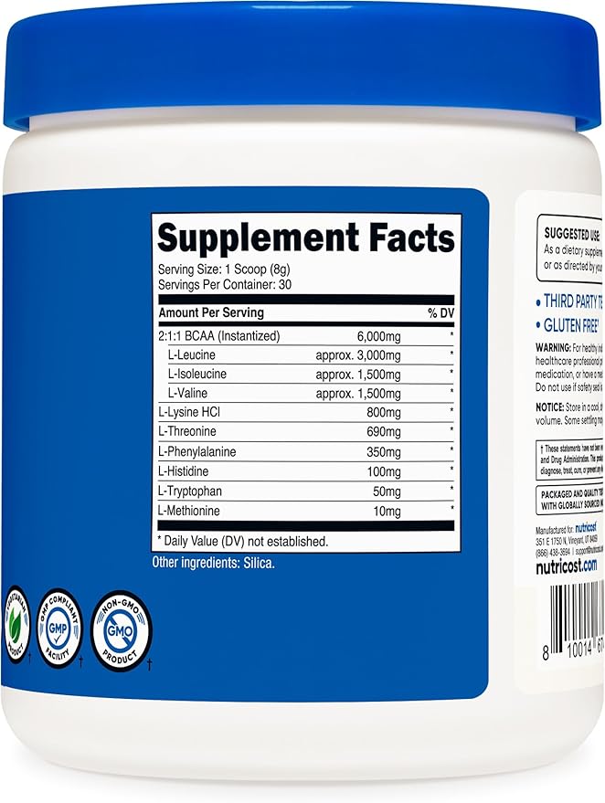 - Nutricost EAA Powder has an optimum blend of essential amino acids and contains 8g of EAAs in every serving, 30 servings per container.