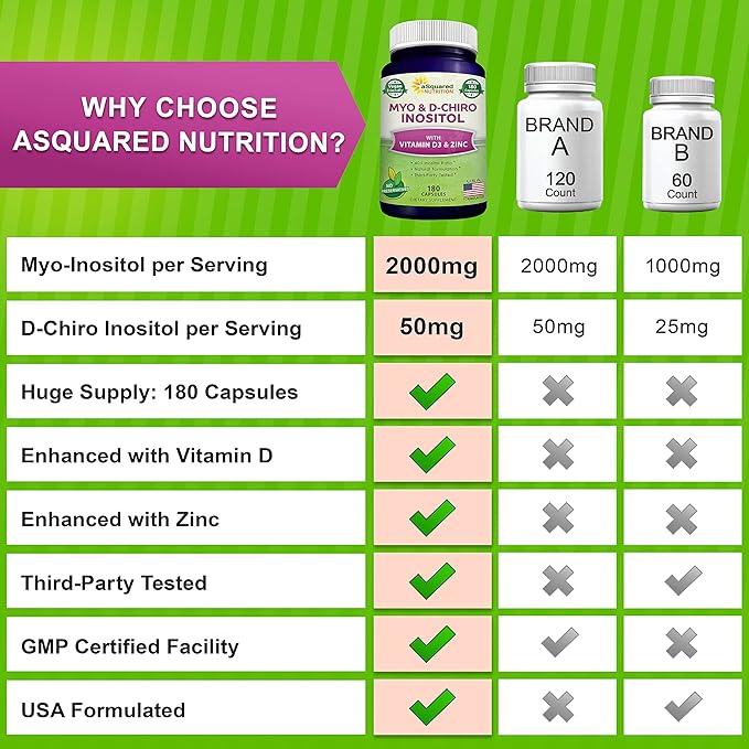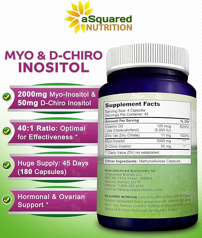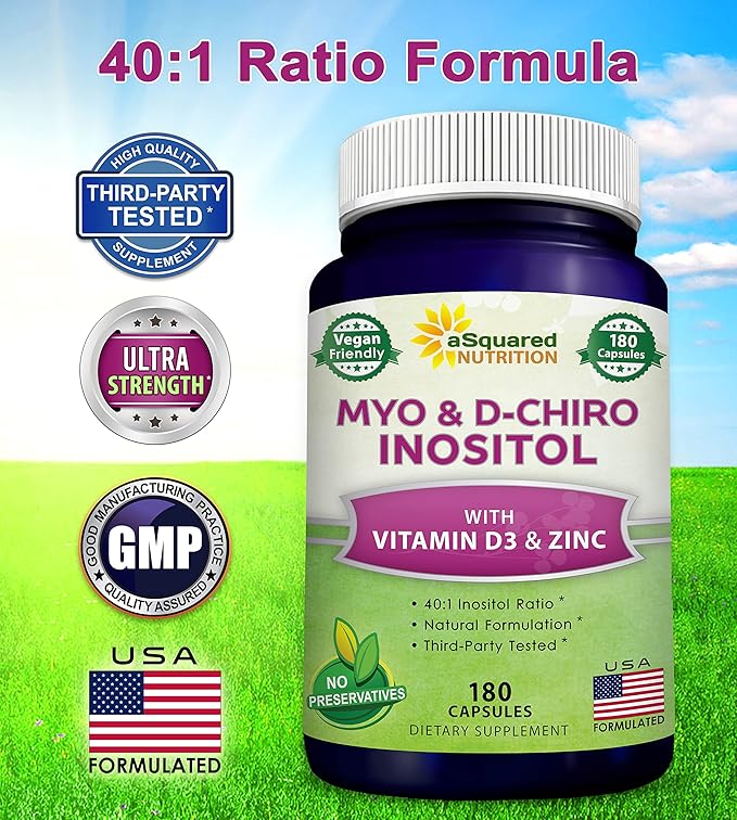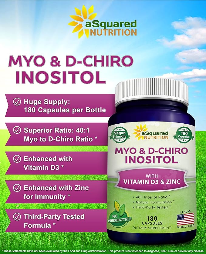 aSquared Nutrition Myo-Inositol & D-Chiro Inositol Supplement - 180 Capsules - Plus Vitamin D3 and Zinc - Myo & D-Chiro Inositol 40 to 1 Ratio - VIT B8 Complex Pills