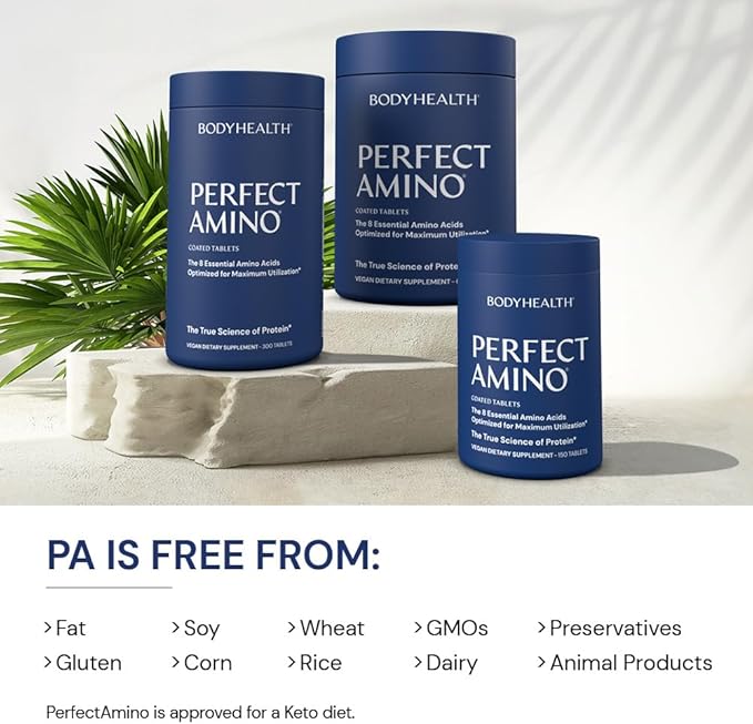 BodyHealth PerfectAmino (150 ct) Easy to Swallow Tablets, Essential Amino Acids Supplement with BCAAs, Vegan Protein for Pre/Post Workout & Muscle Recovery with Lysine, Tryptophan, Leucine, Methionine