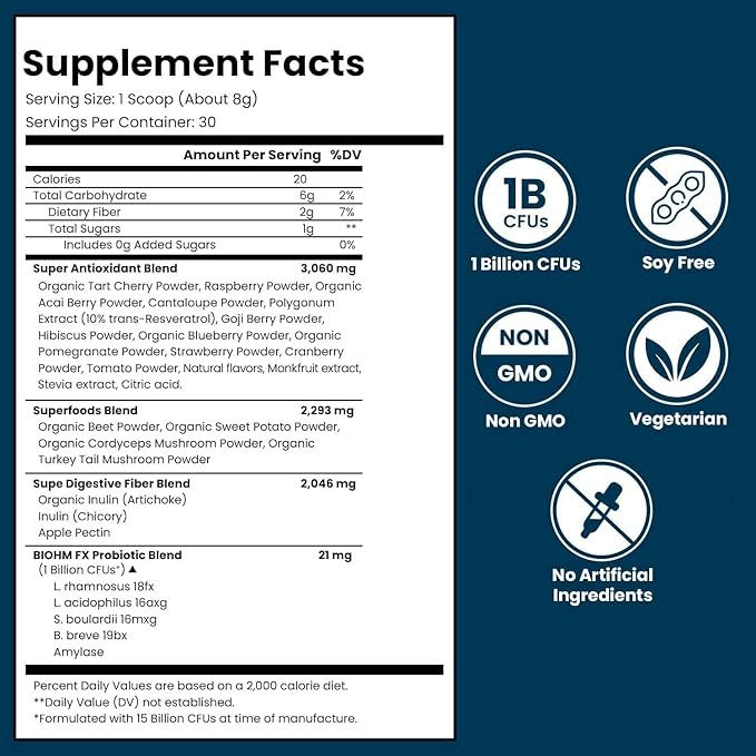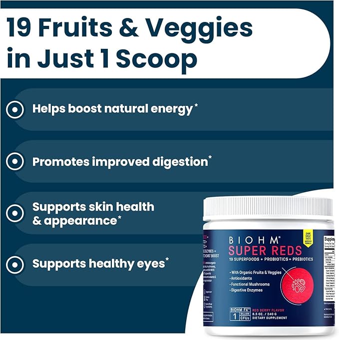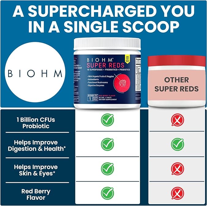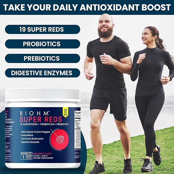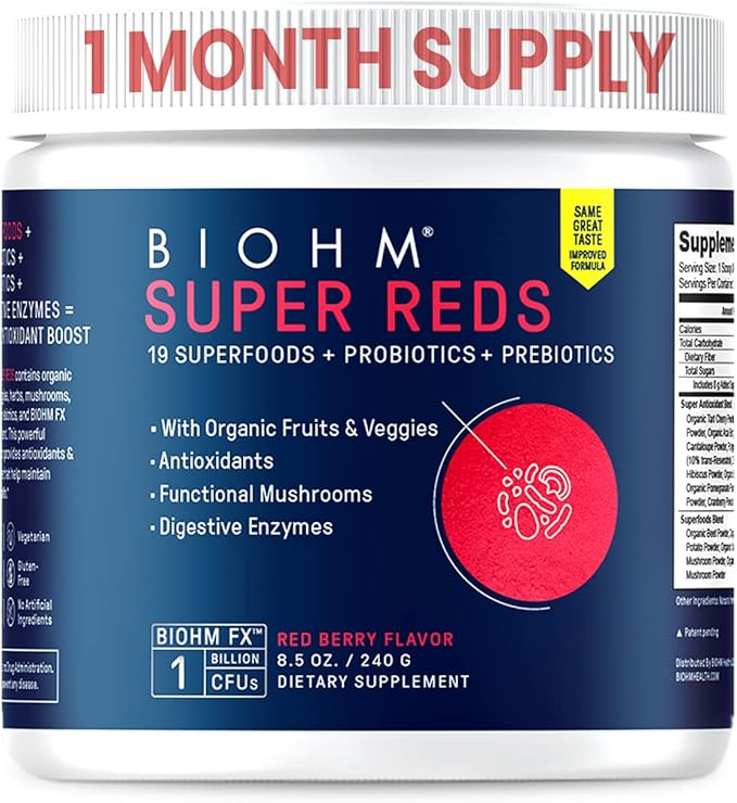 - SUPER REDS POWDER - The BIOHM Super Reds supplement is packed with phytonutrients, antioxidants & superfoods like beets, pomegranate, tart cherry extract, blueberry, raspberry, strawberry, acai, digestive enzymes, and probiotics.