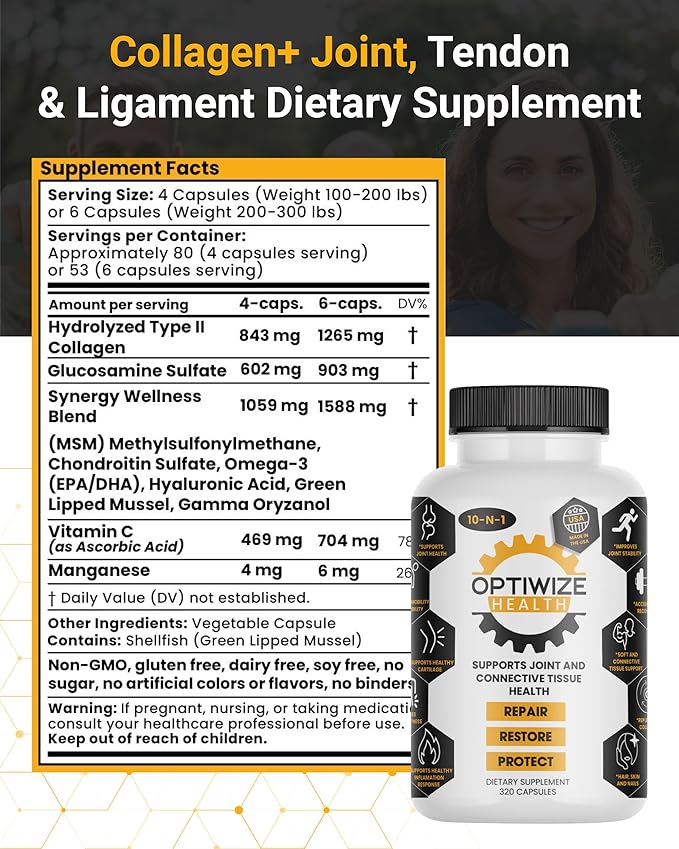 10-in-1 Joint Support Hydrolyzed Collagen,MSM, Hyaluronic Acid, Glucosamine,Chondroitin & More- Targets Joint Discomfort, Improves Mobility & Flexibility 320 Caps for Men & Women Made in USA