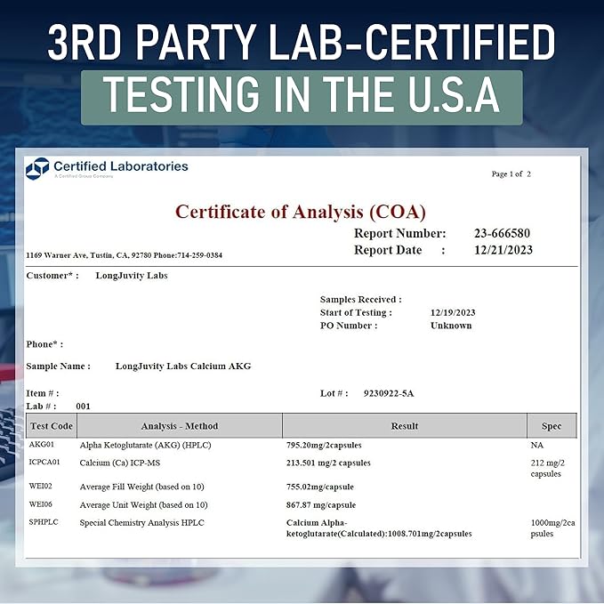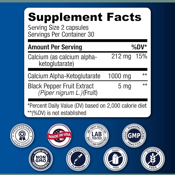 - NATURALLY SOURCED & LAB TESTED FOR QUALITY: Our Calcium Alpha-Ketoglutarate supplement is made from high-quality, naturally sourced ingredients and independently lab-tested for purity, so you can trust what’s inside. Crafted in the USA in a GMP-compliant, ISO-certified facility, our supplement meets the highest quality standards.