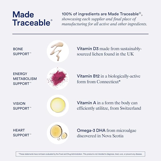 - MADE TRACEABLE: Our world-class scientists scoured the globe for high quality ingredients when formulating Essential for Men Multivitamin 18+. Our formula includes Vitamin D3 made from sustainably-sourced lichen found in the UK - for bone support, Vitamin B12 in a biologically-active form from Connecticut - for brain support, Vitamin A in a form the body can efficiently utilize, from Switzerland - for immune support, and Omega-3 DHA from microalgae discovered in Nova Scotia - for heart support.*