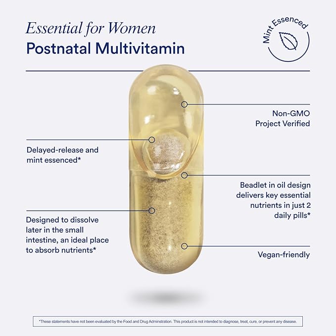 - ESSENTIAL FOR WOMEN POSTNATAL MULTIVITAMIN: is for the arrival of a mother’s new nutrient needs. It’s formulated with 15 key nutrients for 6 months postpartum, and throughout lactation. Our formula is vegan, sugar-free, gluten-free, dairy-free, nut-free, soy-free, and formulated without stevia, sugar alcohols, and artificial colors, flavors, or sweeteners. Each serving provides 350mg of Omega-3 DHA.*