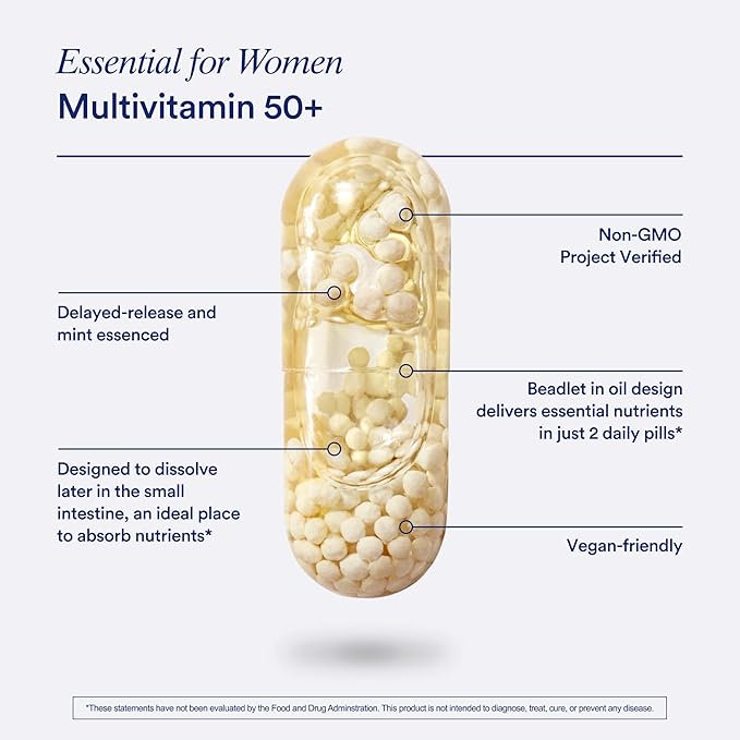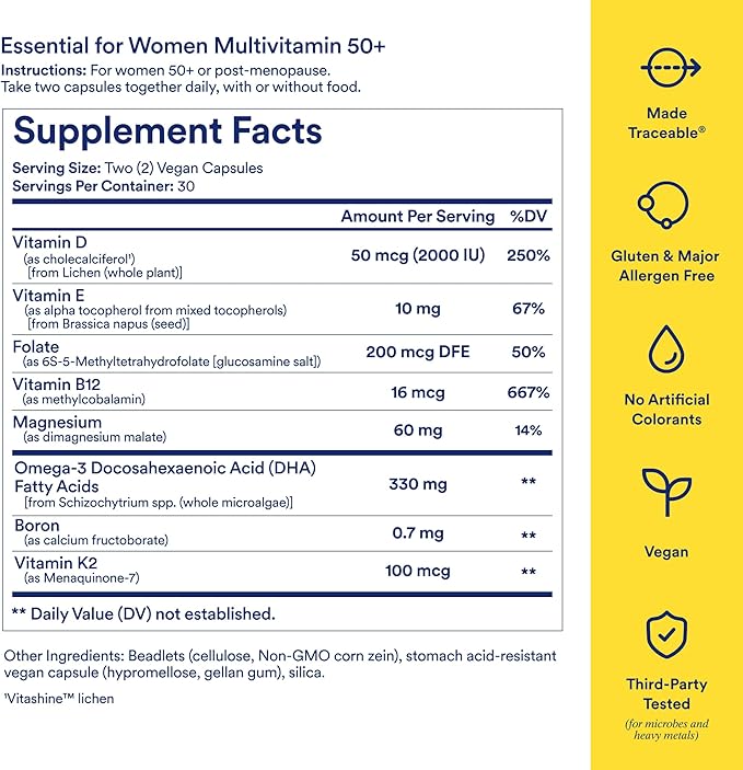 - ESSENTIAL FOR WOMEN MULTIVITAMIN 50+: is the multivitamin reimagined for women post-menopause with 8 key nutrients to support healthy aging from within. Our formula is vegan, sugar-free, gluten-free, dairy-free, nut-free, soy-free, and formulated without stevia, sugar alcohols, and artificial colors, flavors, or sweeteners. Each serving provides 330mg of Omega-3 DHA.*
