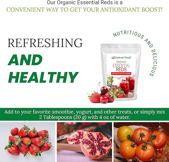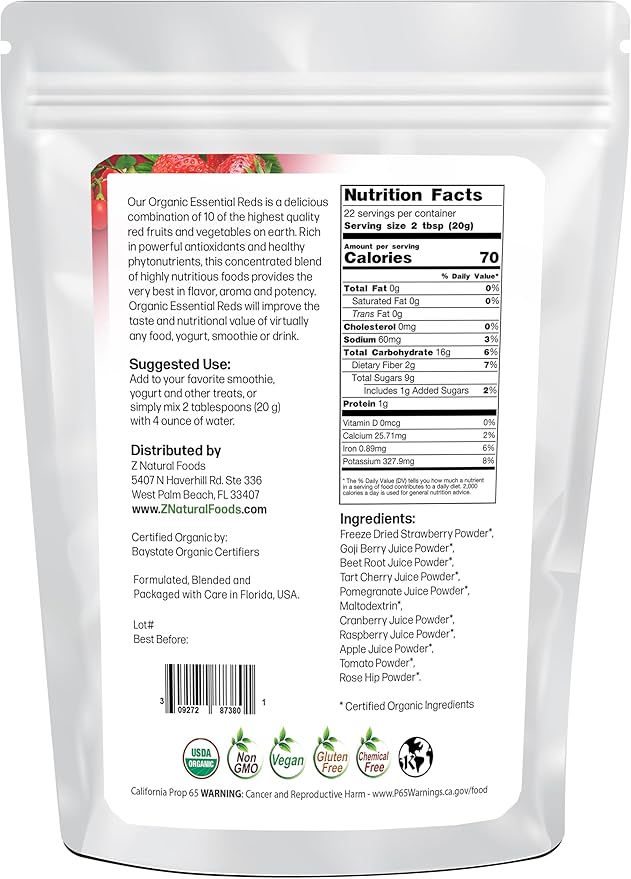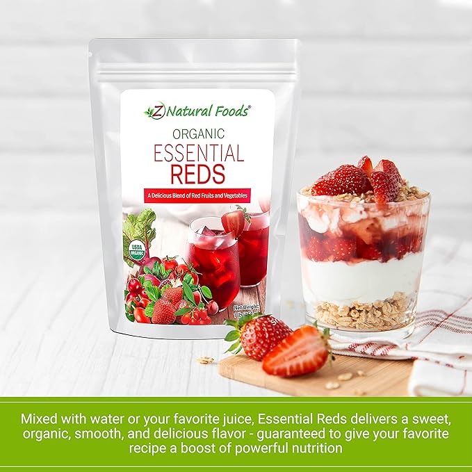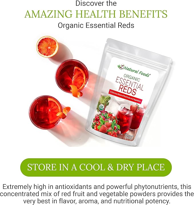 Z Natural Foods Organic Essential Reds, Organic Juice Powder, Super Blend of 10 Red Fruits and Vegetables, Superfood Smoothie Powder, Non-GMO, Vegan, 1 lb