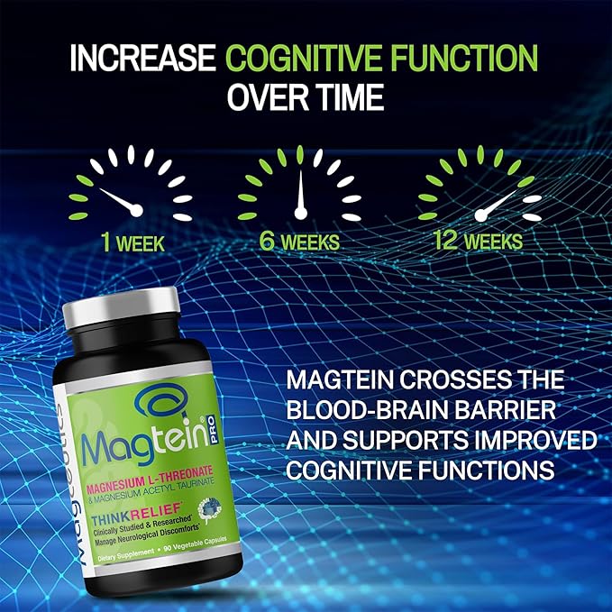 MagteinPRO - Magnesium L-Threonate & Mag Acetyl Taurinate Supplement, Memory, Sleep & Brain Health Formula for Men & Women, Cognitive Support for Adults, Clinically Studied- 90 Veg Capsules