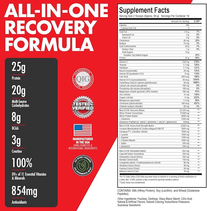 Max Muscle Arm Plus+ Anabolic Recovery Matrix | 25g Protein, 8g Bcaas, 3g Creatine Monohydrate | Whey Protein, Amino Acids, Antioxidants, Glutamine, Electrolytes (Tropical Punch, 2.54 lb)