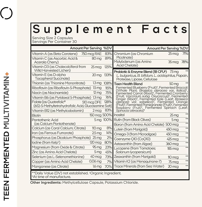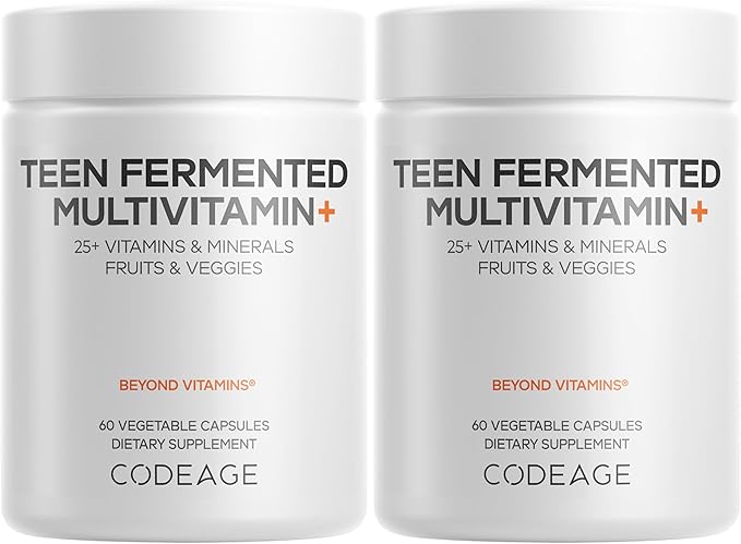 - Extensive Nutrient Profile: Codeage Teen's Multivitamin capsules is formulated with over 25 vitamins and minerals, including vitamins A, C, D3, E, B1, B2, B5, B6, B12, K2, calcium, iron, zinc, magnesium, copper, iodine, selenium, and manganese—providing a wide range of nutrients tailored for teenagers aged 12 to 18.