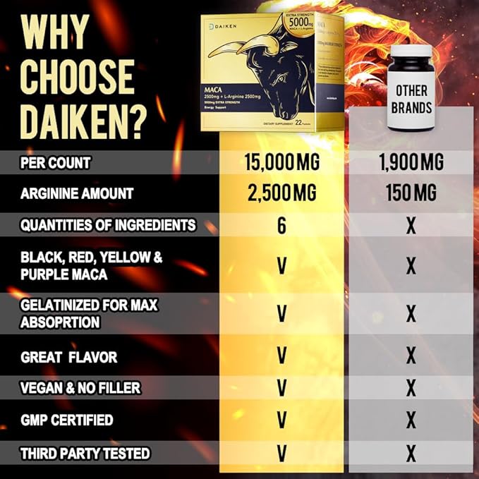 DAIKEN Peruvian Maca Root Powder Extra Strength 15,000 mg, Gelatinized Black, Red, Yellow Maca Blend with L-Arginine (2,500 mg) for Men and Women, Superior Absorption, Vegan, Lab Tested - 22 Packets