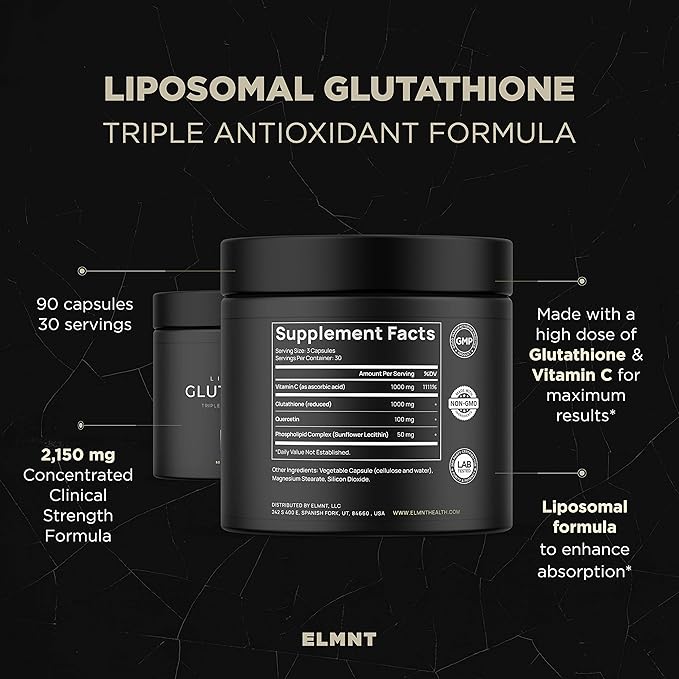 ELMNT 2150mg Super Liposomal Glutathione Supplement w. Vitamin C, Quercetin & Pure L Glutathione 2000mg Triple Action Formula Glutathione Liposomal Supplement w. Phospholipid Layer - 90 Pills, Non-GMO