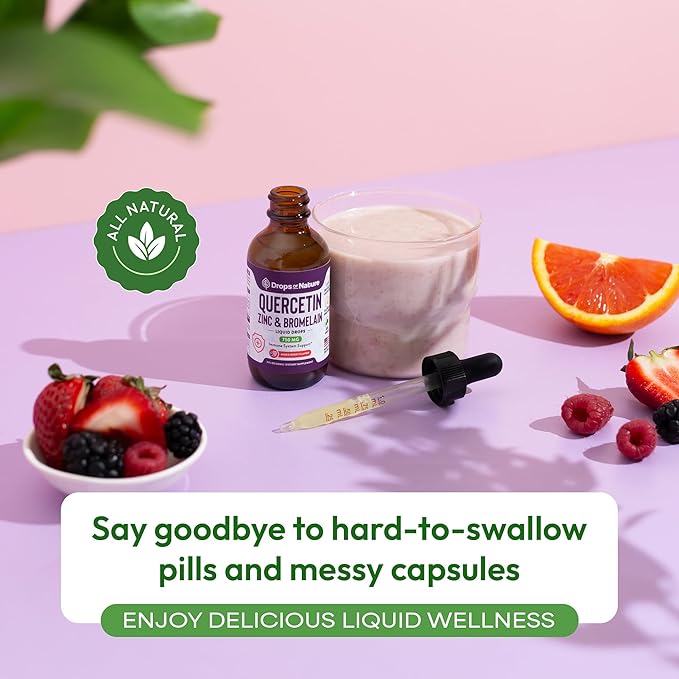 - Sublingual Quercetin Liquid Drops: Provides Quercetin, Bromelain and Zinc per serving; boosts immunity and respiratory wellness; designed for rapid absorption to enhance immune defense; offers an easy-to-take alternative to pills and capsules