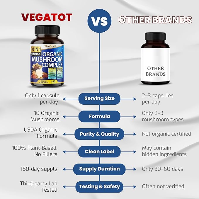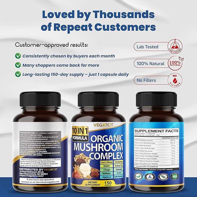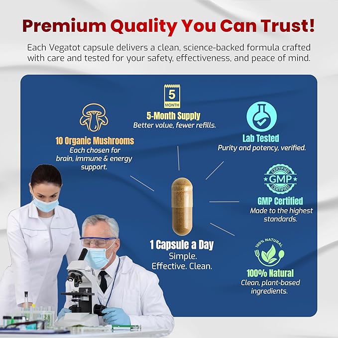 - HIGHEST POTENCY: With just 1 convenient capsule, you'll get all the potent of 10 top tier mushrooms highly concentrated into this 10 in 1 formula. Say goodbye to juggling multiple mushroom supplements - Vegatot Mushroom Complex is all you need to perform at your best.
