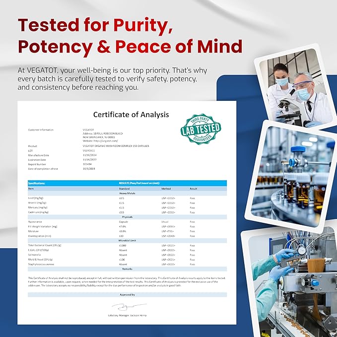 - PURE INGREDIENTS, PURE PEACE OF MIND: Vegatot is committed to providing pure, high-quality supplements that give you peace of mind. Our ingredients are tested strictly by third-party ISO 17025-accredited labs to ensure purity and safety. They are vegan-friendly and free from artificial colors, flavors, preservatives, and common allergens such as gluten, wheat, dairy, soy, sugar, and yeast. Therefore, you can feel good about what you're putting into your body