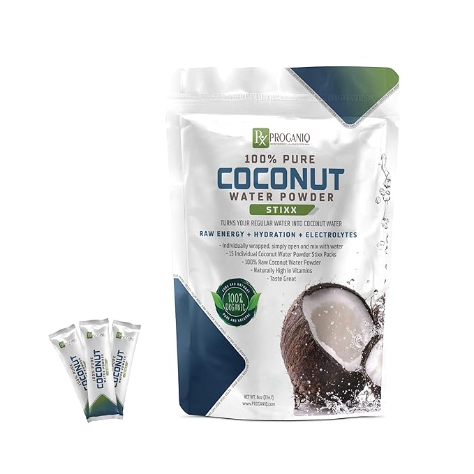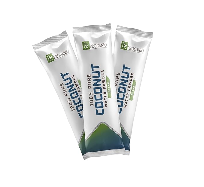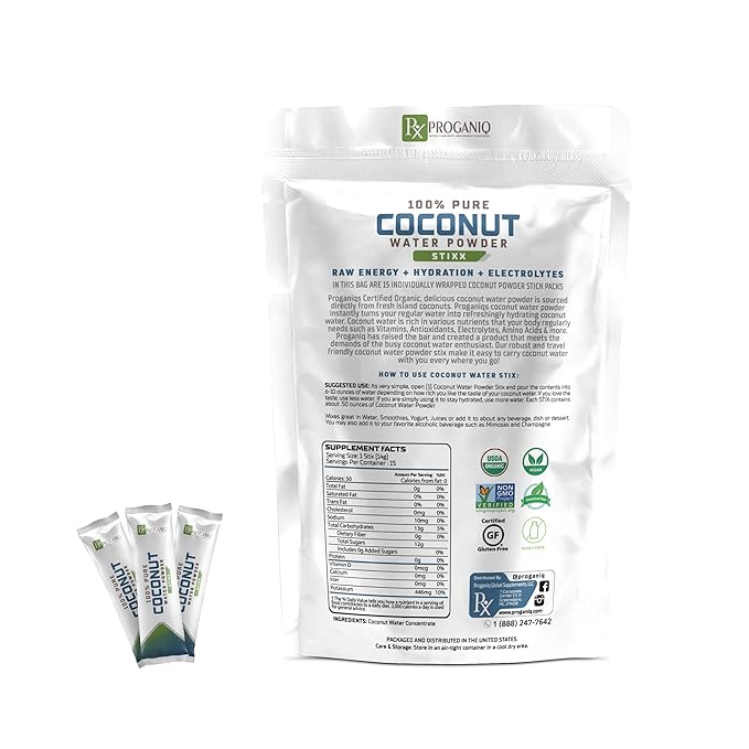 - Pure Coconot Water Powder: Each X Proganiq Stixx packet is filled with pure coconut water powder, instantly transforming regular water into a refreshing coconut beverage. Ideal for hydration on the go, it delivers an authentic coconut water taste.