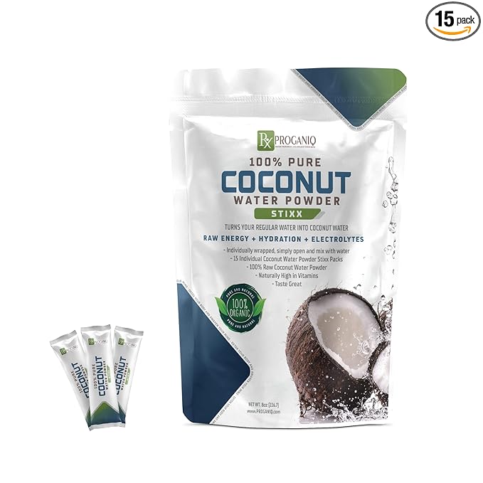 X PROGANIQ Coconut Water Powder Stixx - Pure Coconut Electrolyte Drink in Travel Size Packets - 15 Count - Turn Water into Coconut Water - Ideal for On-the-Go Hydration - Easy, Portable and Refreshing