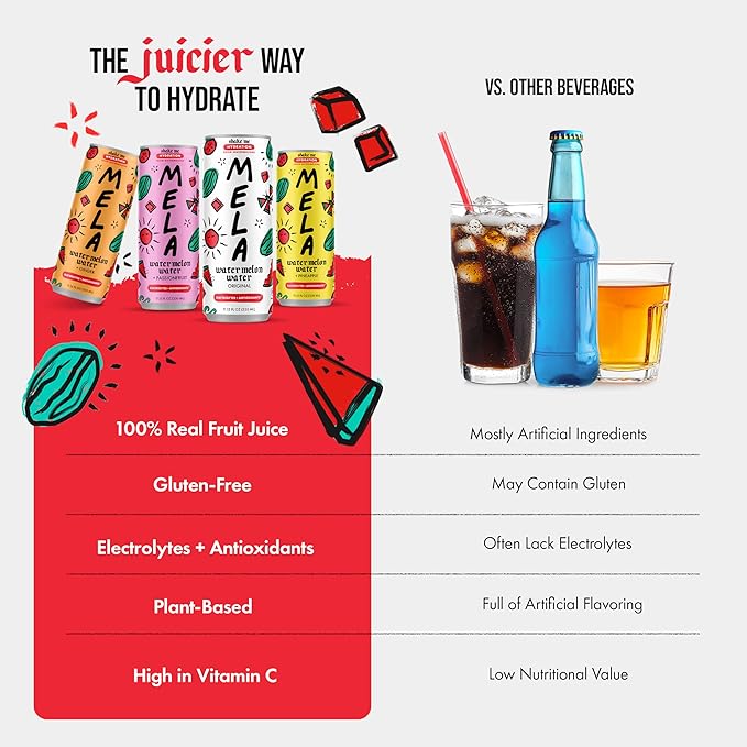 - All-Natural & Pure: Mela stands apart from other watermelon drinks with non-GMO certification, gluten-free, 100% plant-based ingredients—clean hydration, naturally.