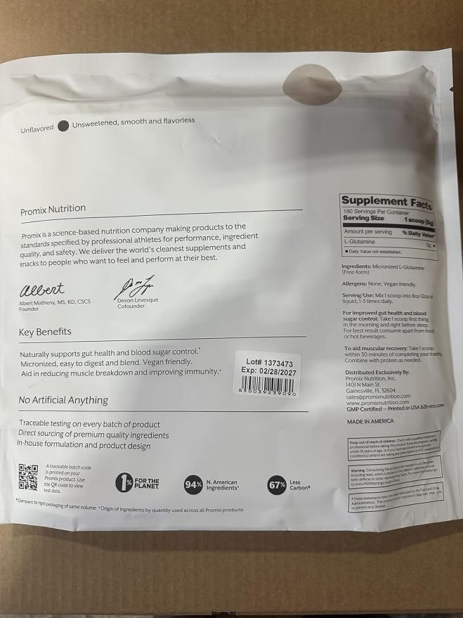 - Seriously Clean: Glutamine is vegan-friendly and free of stevia. All Promix products are free of gluten, soy, GMOs, refined sugar, artificial sweeteners, and xantham gum. 94% of ingredients sourced from North America. Partner of 1% for the Planet. Produced in facilities using GMP (Good Manufacturing Practice) standards.
